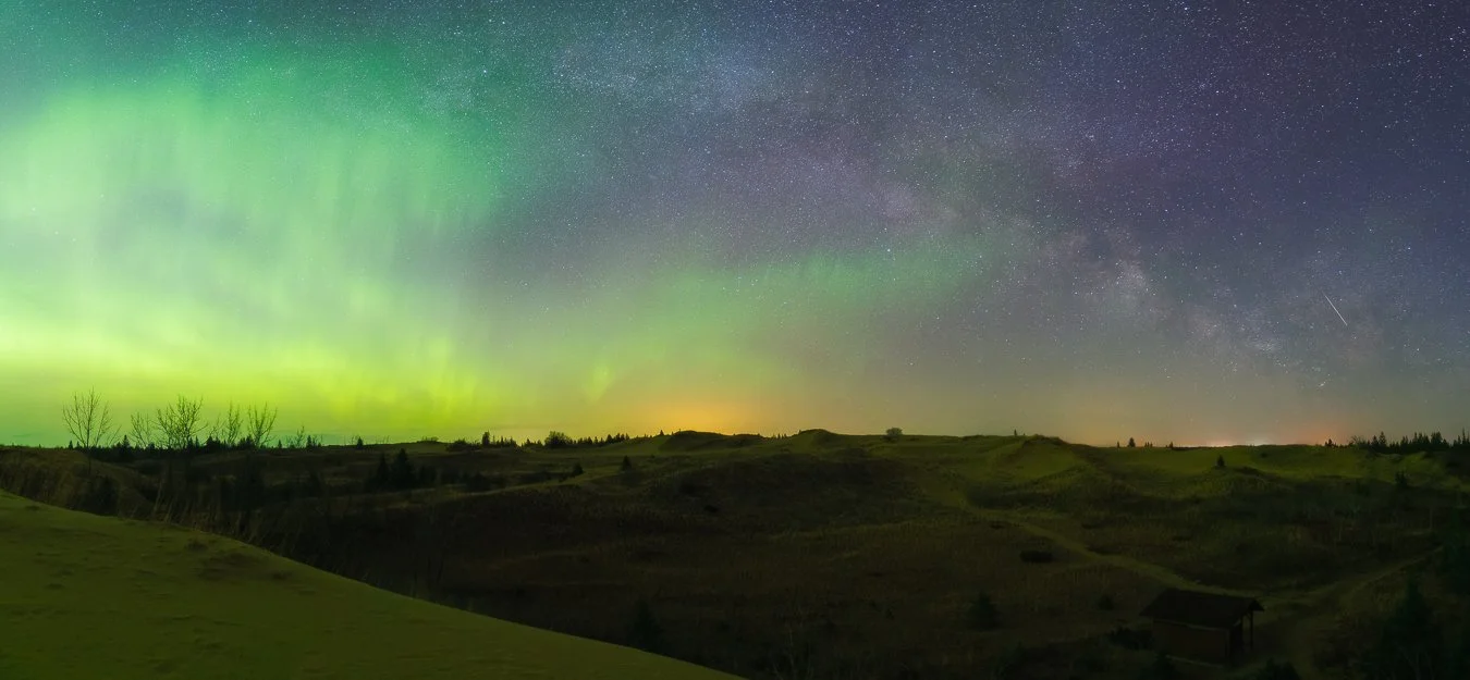 Aiming to capture the early season Milky Way core arching across the horizon from one of my favourite views on the Spirit Sands Self-Guiding Trail, I was treated to a magnificent overhead aurora display lasting all night. The core rose around 4:30 am after being treated to the northern lights for over five hours.