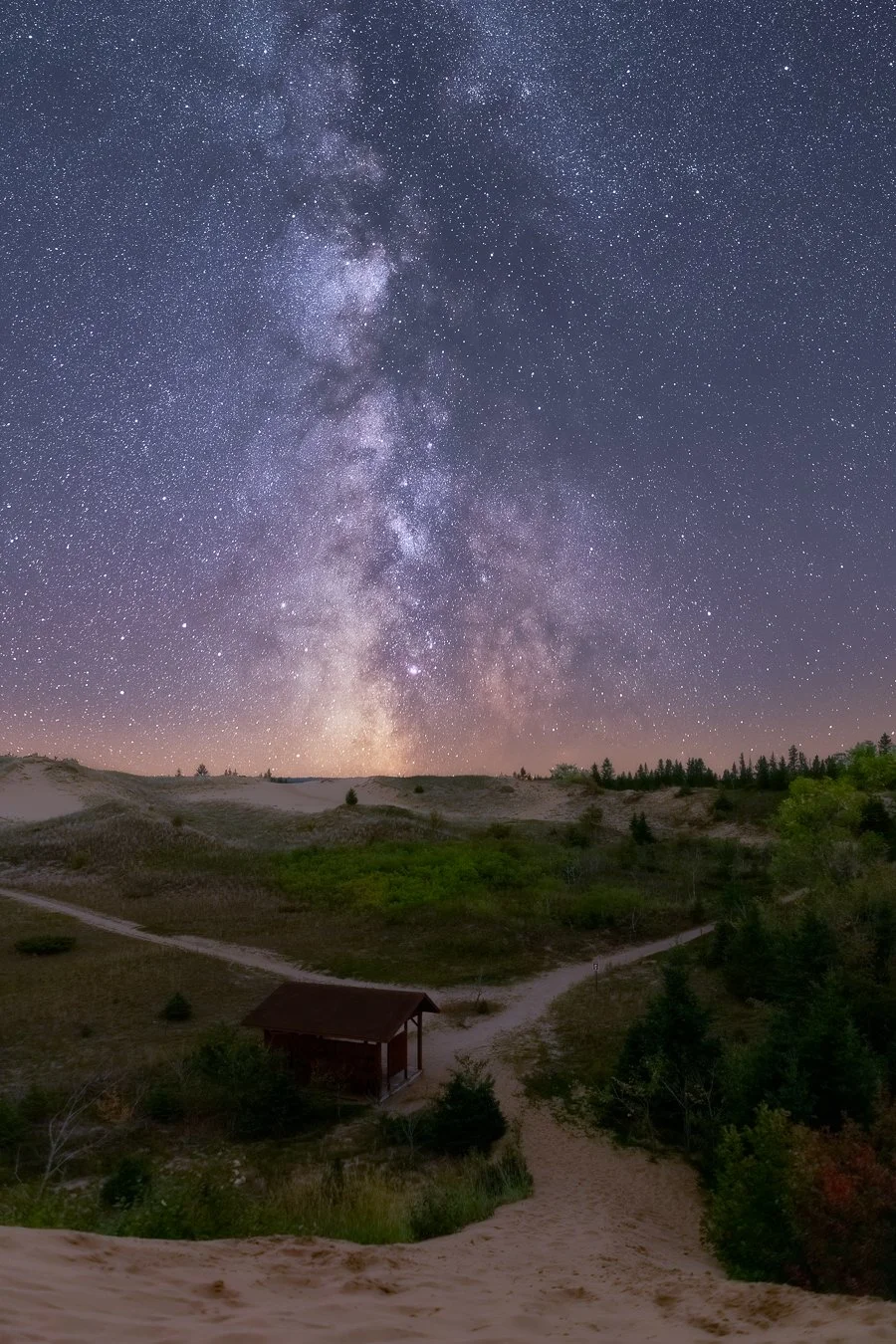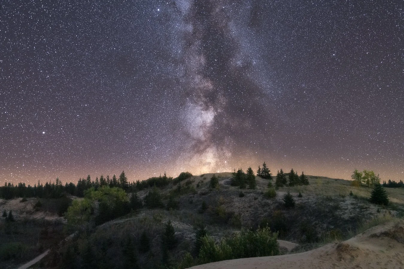 While my main goal in March of the same year was to photograph the Milky Way core over the dunes in the Spirit Sands, the event became dominated by the northern lights. Still determined to shoot a pure Milky Way photo, I returned in September. Due to seasonal variation, the Milky Way was in a more vertical orientation, but I was able to get a set of photos closer to what I had originally envisioned.