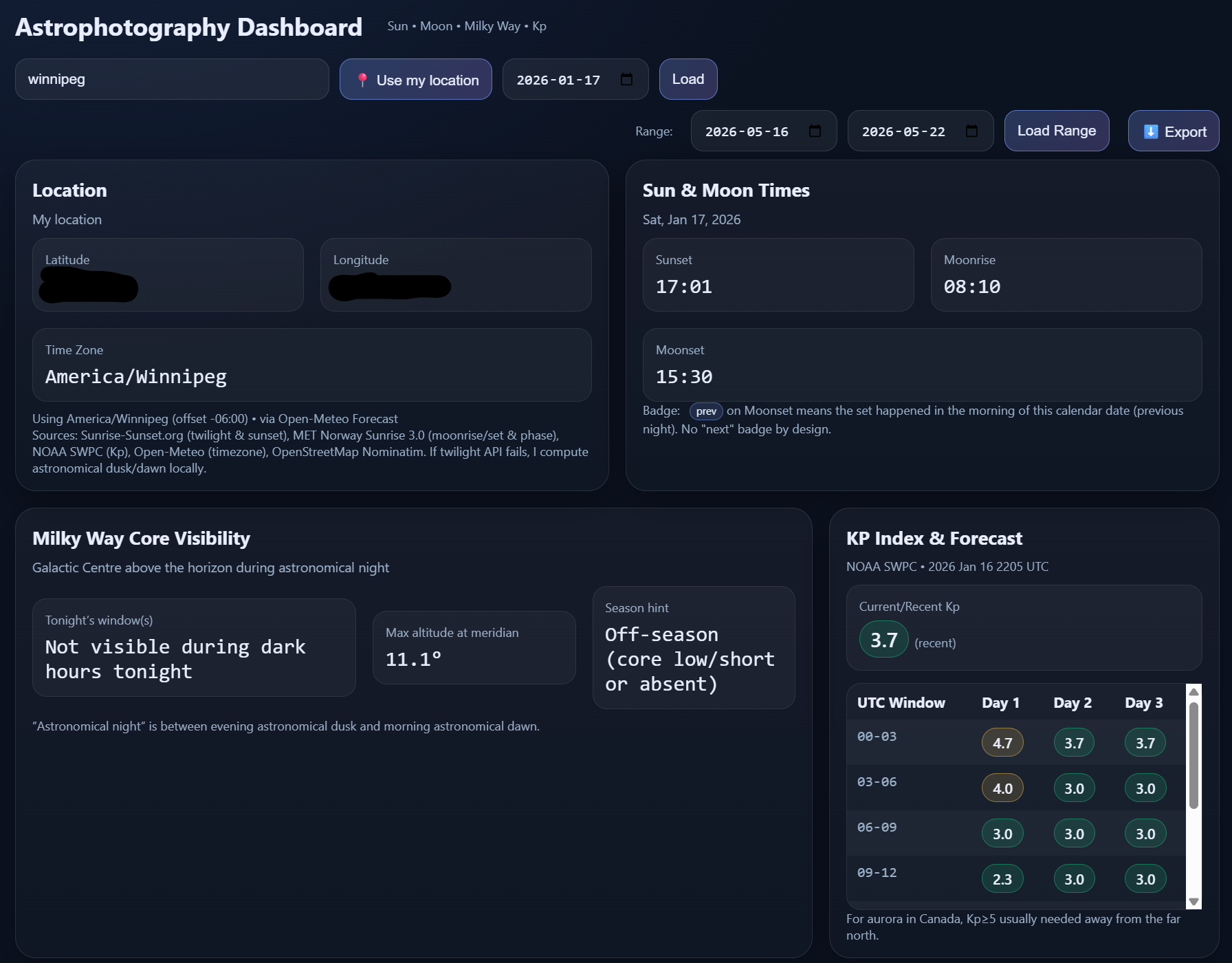 My vision was starting to take shape. It was time to start trying to bring the Astrophotography Dashboard back in. Getting this part right proved to be challenging, but it was important to get it right. While the plans were great for recording ideas, the real power of this app was always going to come from simplifying the research. This planner took several tries to get right. In the end, I benchmarked my results against trusted astronomy/planetarium software including edge cases where the sun never sets or rises (polar night, midnight sun). I can search a location, pick it on a map, or just enter its coordinates. Within seconds, I have all the information I need.