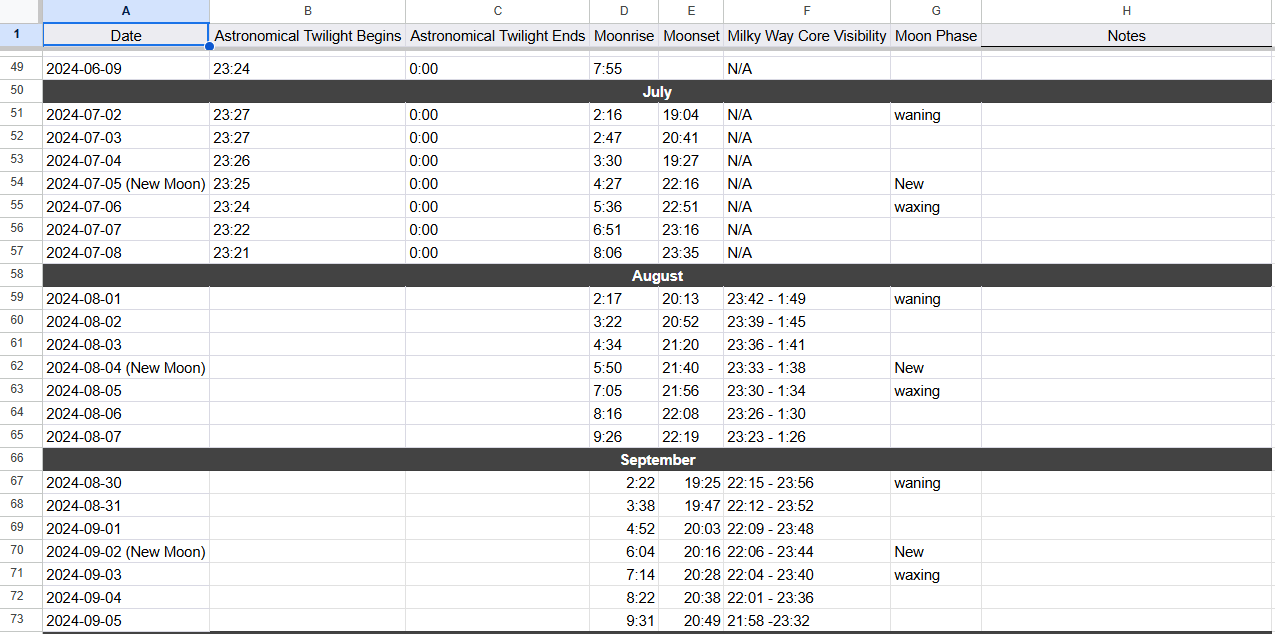 The dashboard was already pretty cool. It was exciting to have a tool like that. It was very easy to set a location and a date. Those were the important bits anyway. The colour coded table was already so much better than my alternative. I was using PhotoPills before. Like everybody else. But when trying to compare nights, or long term planning, the manually scrubbing through day by day using inputs buried layers deep. Then there was manually entering collected information into a spreadsheet. And that was only good for one location. Where and when the Milky Way core will be, and even its shape heavily depend on your longitude and more heavily, latitude. This most basic form of my tool was already solving real pain points.