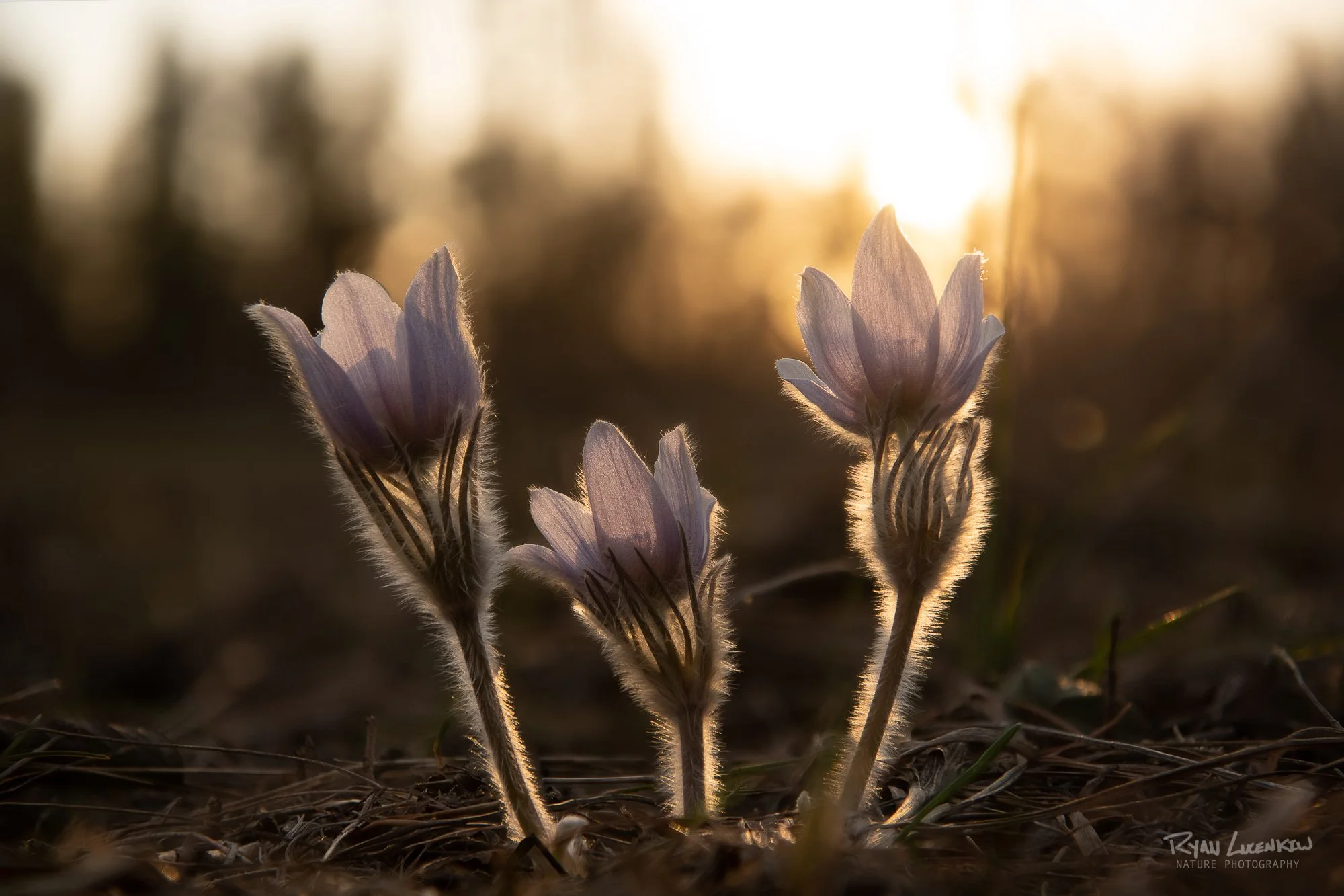 Macro photography is all about getting up close and personal with a subject. There where a lot of trees in the background, and I was looking through the flowers at the sun setting in the treeline behind. There was a wonderful golden backlighting on the flowers making all their little hairs glow.